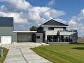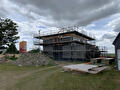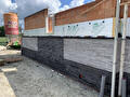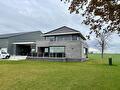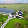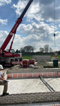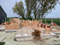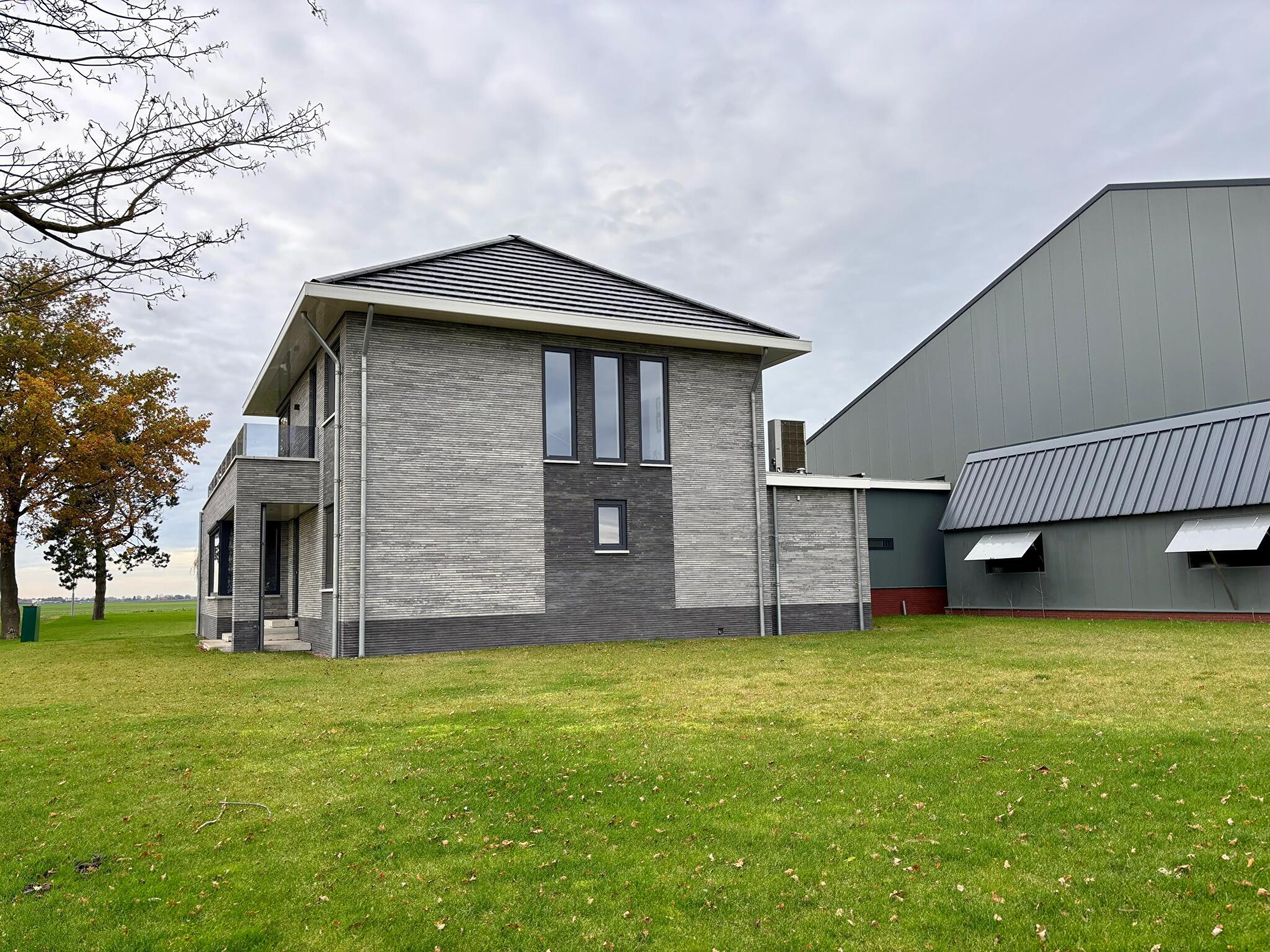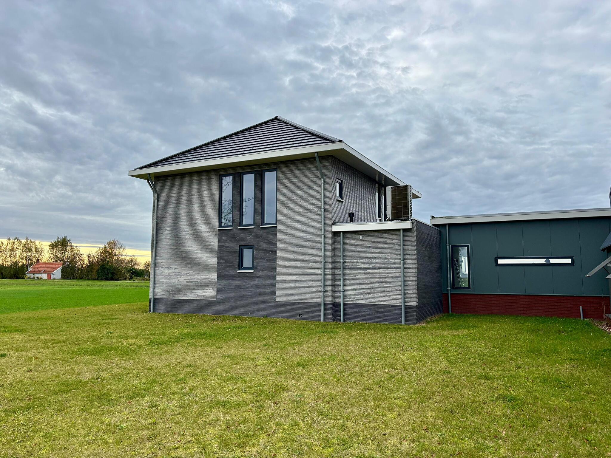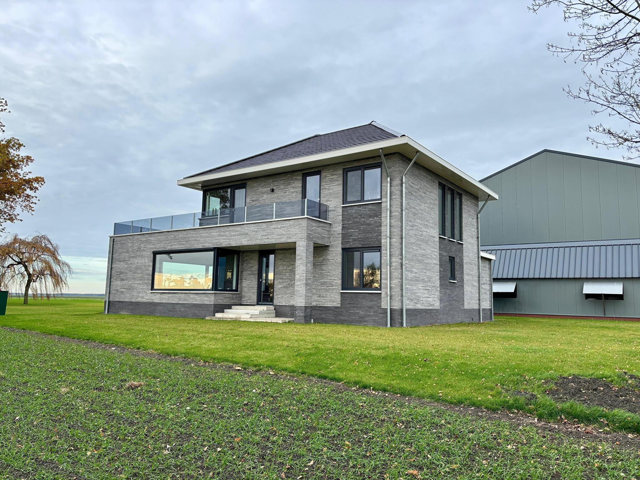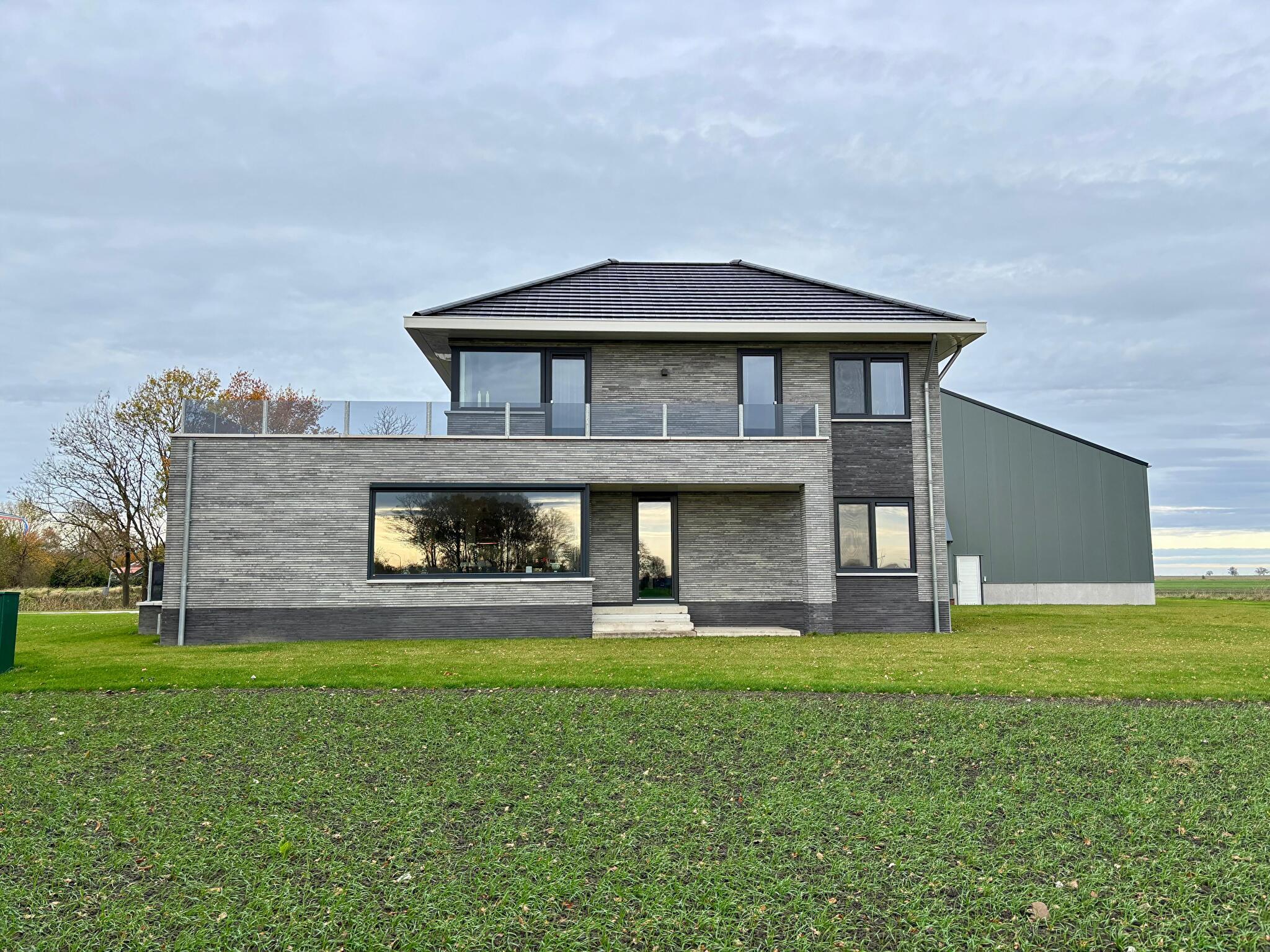 In 2018 hebben we voor onze opdrachtgever aan de Oudedijk in Drieborg een nieuwe loods mogen bouwen. een aantal jaar later was de woning door bodemdaling onherstelbaar beschadig. Wij zijn gevraagd om het oude woonhuis te slopen en een nieuwe moderne villa te bouwen. Om verzakking in de toekomst te voorkomen komt de woning volledig op een fundering met heipalen. De villa krijgt een zeer modern en strak uiterlijk, er daarom gekozen om de buitengevels te metselen met een 60 cm lange en 4 cm dikke betonsteen. Doordat we deze stenen stootvoegloos en met een zeer dunnen voeg van 6mm vermetselen ontstaat een erg strak resultaat. Om een mooi contrast te krijgen in de gevels is gekozen om 2 kleuren stenen te gebruiken.