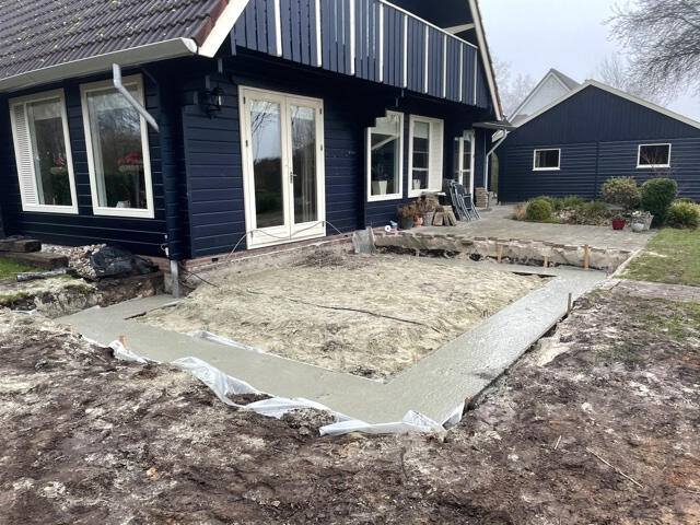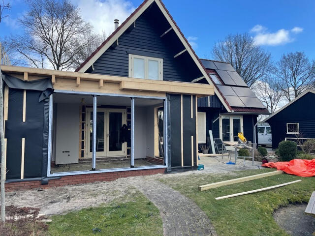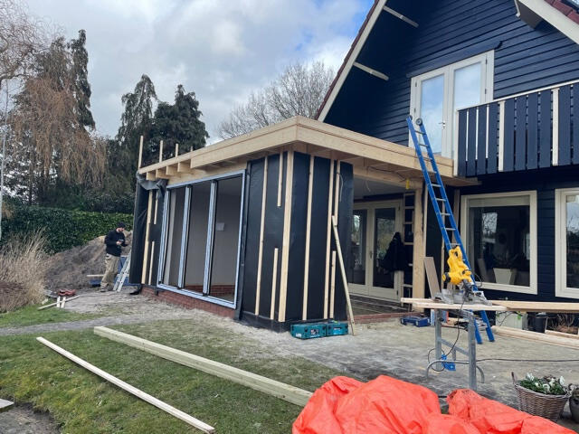 In Bellingwolde zijn we begonnen met de aanbouw aan de achterzijde van de woning. Met deze uitbouw wordt de woonkamer vergroot en meer betrokken bij de tuin. De wanden en het dak worden geïsoleerd conform bouwbesluit, waardoor het weinig energie vraagt om dit extra gedeelte te verwarmen. Om toch in stijl van de woning te blijven werken we de buitenkant af met Red Cedar, welke wij verticaal vastzetten.